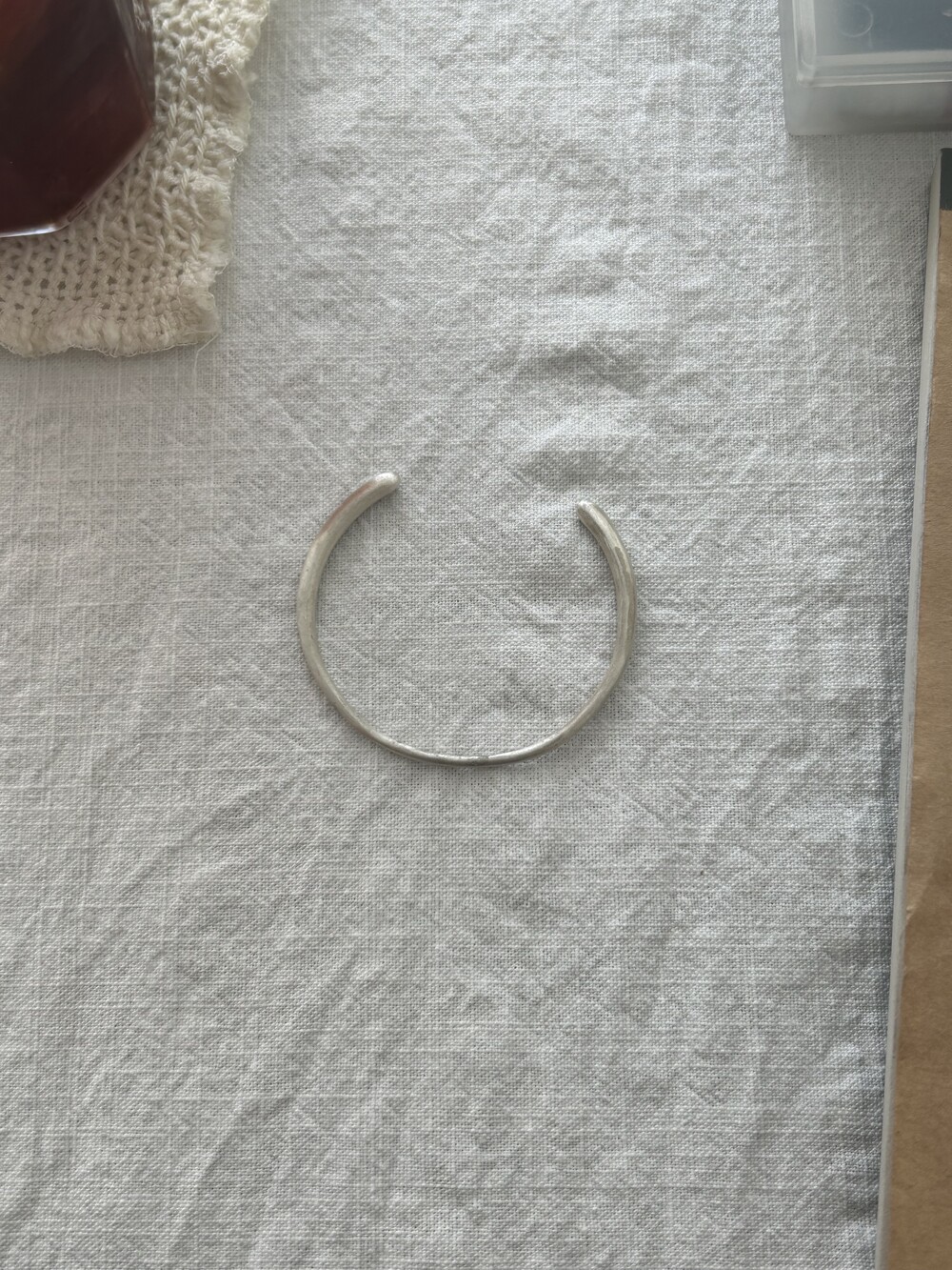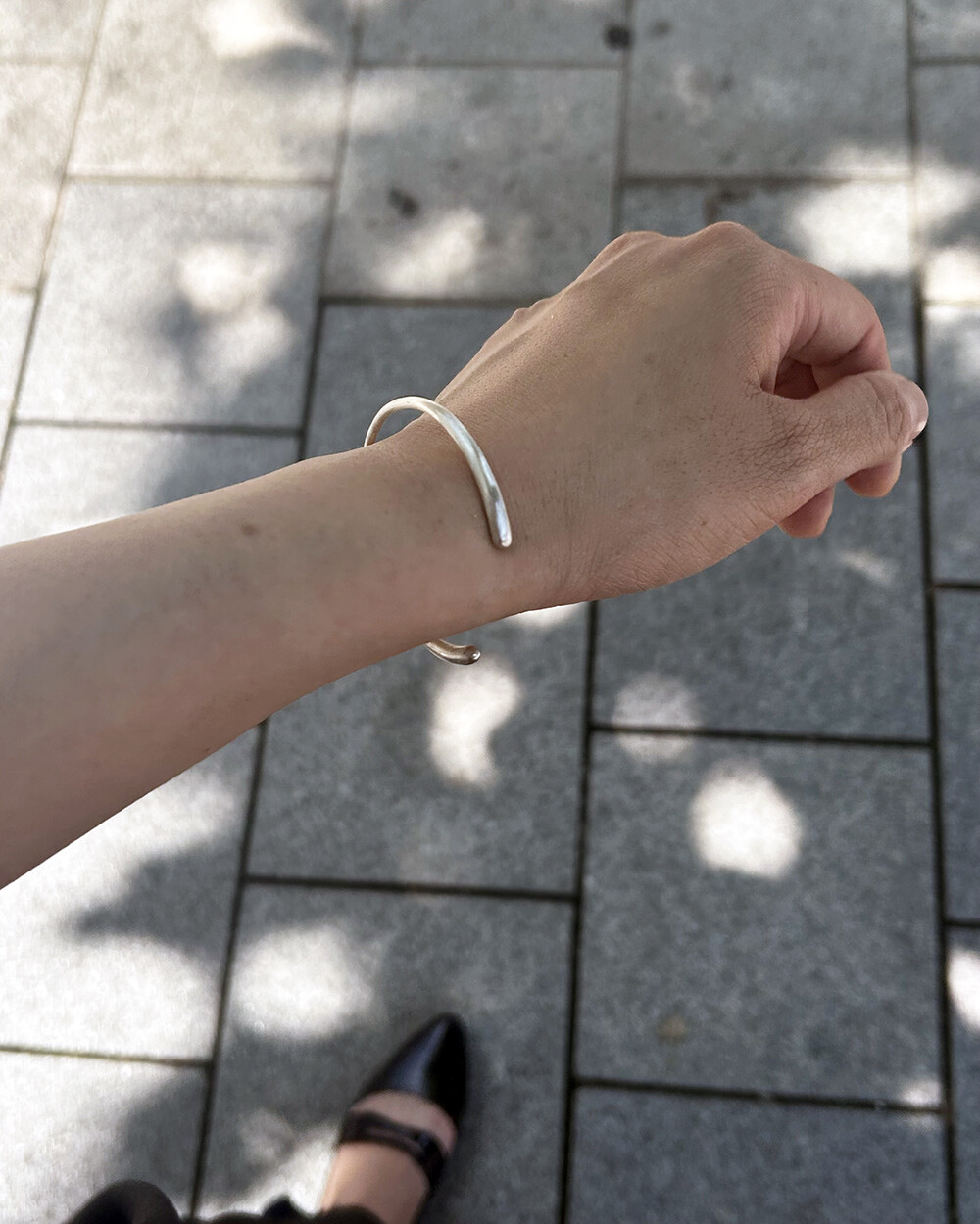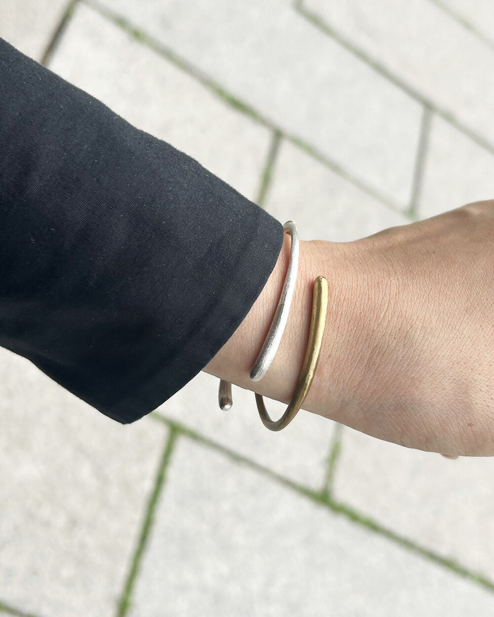 양쪽에 볼륨감을 주어 깎아 만든 무게감 있는 뱅글 스타일의 팔찌 입니다.